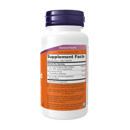 Tags: grape seed extract, antioxidant, polyphenols, OPC, cardiovascular health, immune support, vascular health, NOW Foods, mega potency, non-GMO, vegan supplement, amla extract