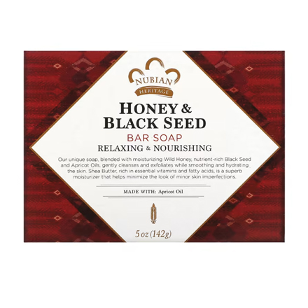 標籤 Nubian Heritage, 蜂蜜黑籽香皂, 黑種草籽油, 杏桃仁油, 乳木果油, 天然香皂, 舒緩滋養, 保濕, 去角質, 公平貿易, 無動物測試, 永續生產, RSPO認證, 敏感肌膚, 身體清潔, 野生蜂蜜, 天然護膚, 潔膚皂